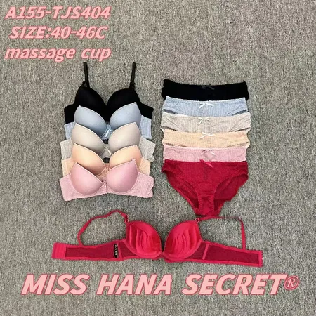 The Miss Hana Secret Massage Cup Bra Set (A155-TJS404) is designed for both comfort and support. It features a massage cup construction that aims to provide a soothing and comfortable wearing experience. Available in colors such as black, light blue, beige, pink, and red, this set offers options to match different styles and preferences. With a size range of 40-46C, it ensures a supportive fit for various body types. Crafted with quality materials, this lingerie set from Miss Hana Secret combines functional design with a range of appealing colors, making it a great choice for those seeking comfort-centric undergarments.