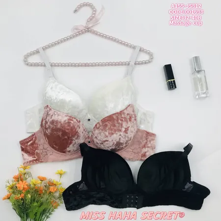 Indulge in luxurious comfort with these Miss Hana Secret massage cup bras! Crafted from soft, plush velvet (in elegant white, romantic pink, and sleek black), they feature delicate lace trim and a supportive push-up design—with subtle details like decorative buttons and a buckle accent for extra charm. The massage cup construction blends a flattering silhouette with all-day coziness, perfect for adding a touch of opulence to your intimate wardrobe. Available in size 32-40B!