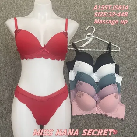The Miss Hana Secret Massage Up Lingerie Set combines comfort and elegance. It features a massage cup design for enhanced comfort, scallop-edged details, and delicate lace accents for a feminine touch. The matching thong complements the bra’s design, available in colors like red, black, white, teal, lavender, and pink. Sized 38-44B (code: A155TJS814), this set offers both supportive functionality and charming style, making it an excellent choice for those seeking a balance of comfort and sophistication in their intimate wear.