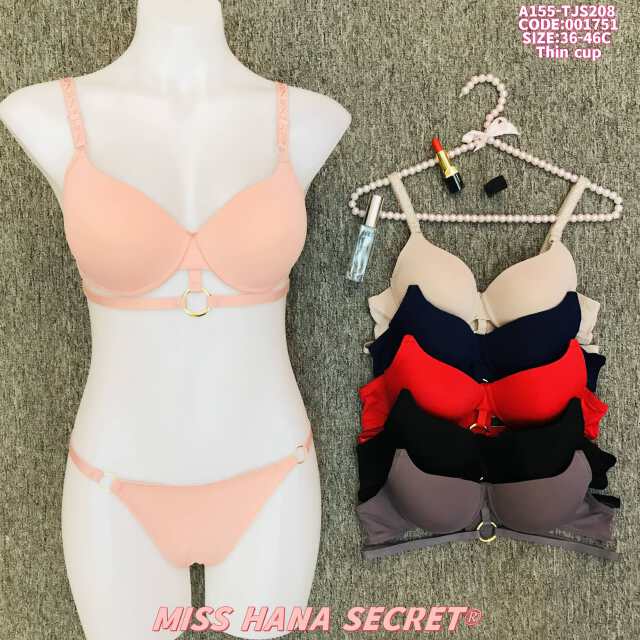 Introducing the Miss Hana Secret Thin Cup Lingerie Set, a perfect blend of style and comfort. Featuring a sleek design with a distinctive metal ring detail, this set includes a thin-cup bra for a natural look and matching panties. Available in a range of colors such as pink, beige, navy, red, black, and gray, and sized 36-46C (Code: 001751), it caters to diverse body types and style preferences. Crafted for everyday wear, it offers both a flattering silhouette and a comfortable fit, making it an essential addition to your intimate wear collection.