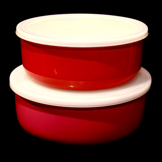 Displayed is a set of mixing bowls made of durable stainless steel and with a plastic lid. The exterior is coated red for a unique touch of style. These bowls are great for mixing and serving your freshly prepared salad.