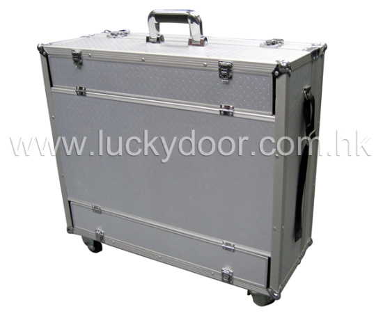 Featuring a plywood construction with ABS plastic exterior laminate, this beauty station is a perfect piece of equipment for ladies who apply their cosmetics on-the-go. The aluminum profile and chrome-plated aluminum corners exude style and refinement, while the case interior boasts black velvet lining for a tasteful touch. The 2 front castors and 2 back wheels make it easy to move the beauty station around.