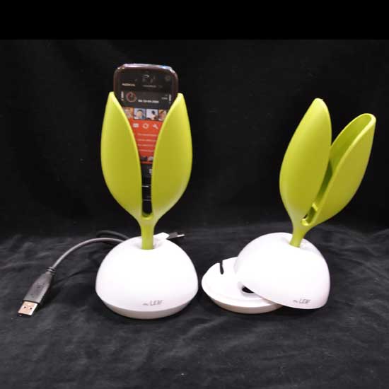 This mobile phone holder comes in a modern, simple and natural design. It features a bud supported by a circular stand in white, showcasing a pleasant design. The holder also comes with charging cables, offering exceptional convenience.