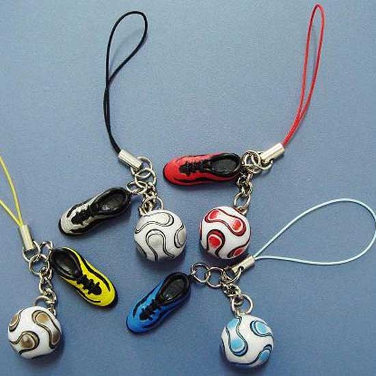 Displayed here are some mobile phone straps in a sport-themed design. Each piece comes with a pendant resembling a miniature soccer ball or a sport shoe. Show off your sporty side with these mobile phone straps.