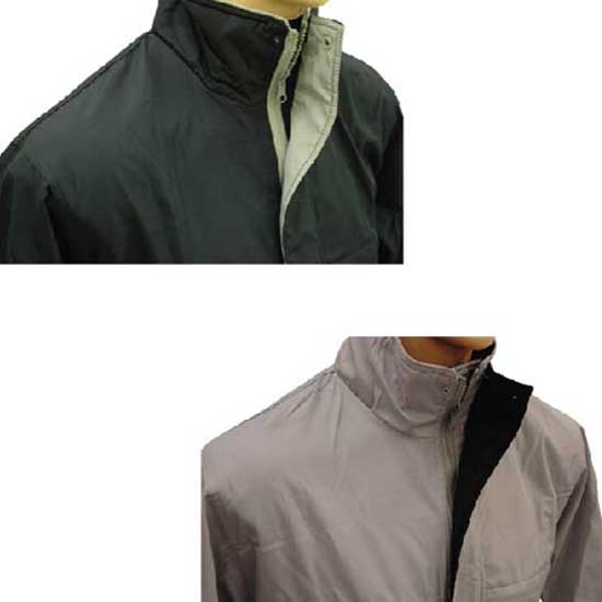 Pictured is a gentlemen’s jacket designed with a concealed front zipper. The bonded microfiber composition is lightweight, dense and easily cleanable. The mock-neck detail and modest color easily fit daily styles.