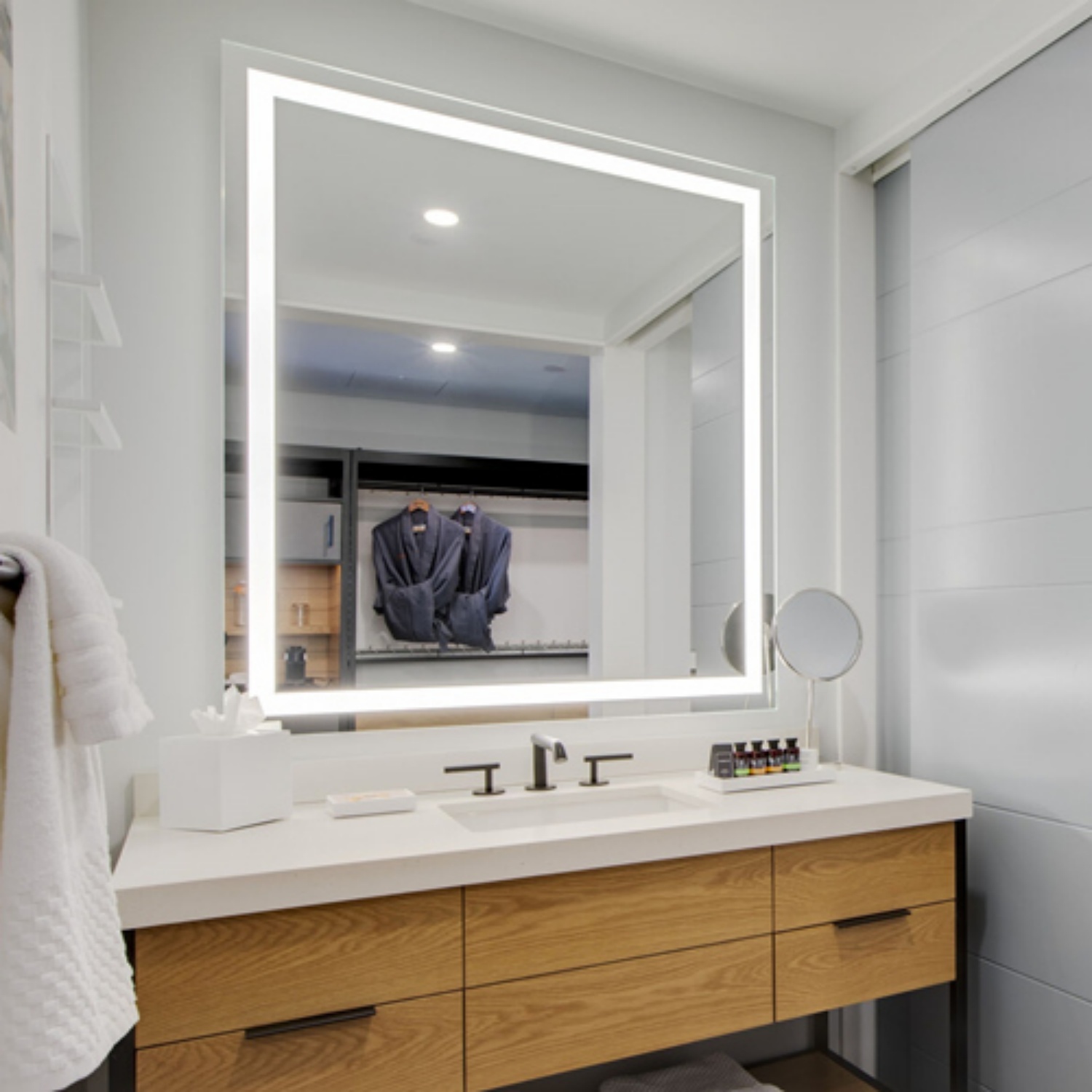 Sleek and contemporary, this stunning electric LED mirror elevates your space, bathroom, bedroom or powder room. With 4 sides luminous LED light, it can provide you with good lighting. Designed with silvered reflection layer, this beautiful backlit wall mounted mirror is environmental friendly. It creates the most realistic and clear reflection, also much less corrosion rate compared with normal silver mirrors. This elegant square illuminated bathroom mirror will fit a variety of interior designs, suitable for both commercial and home decor.