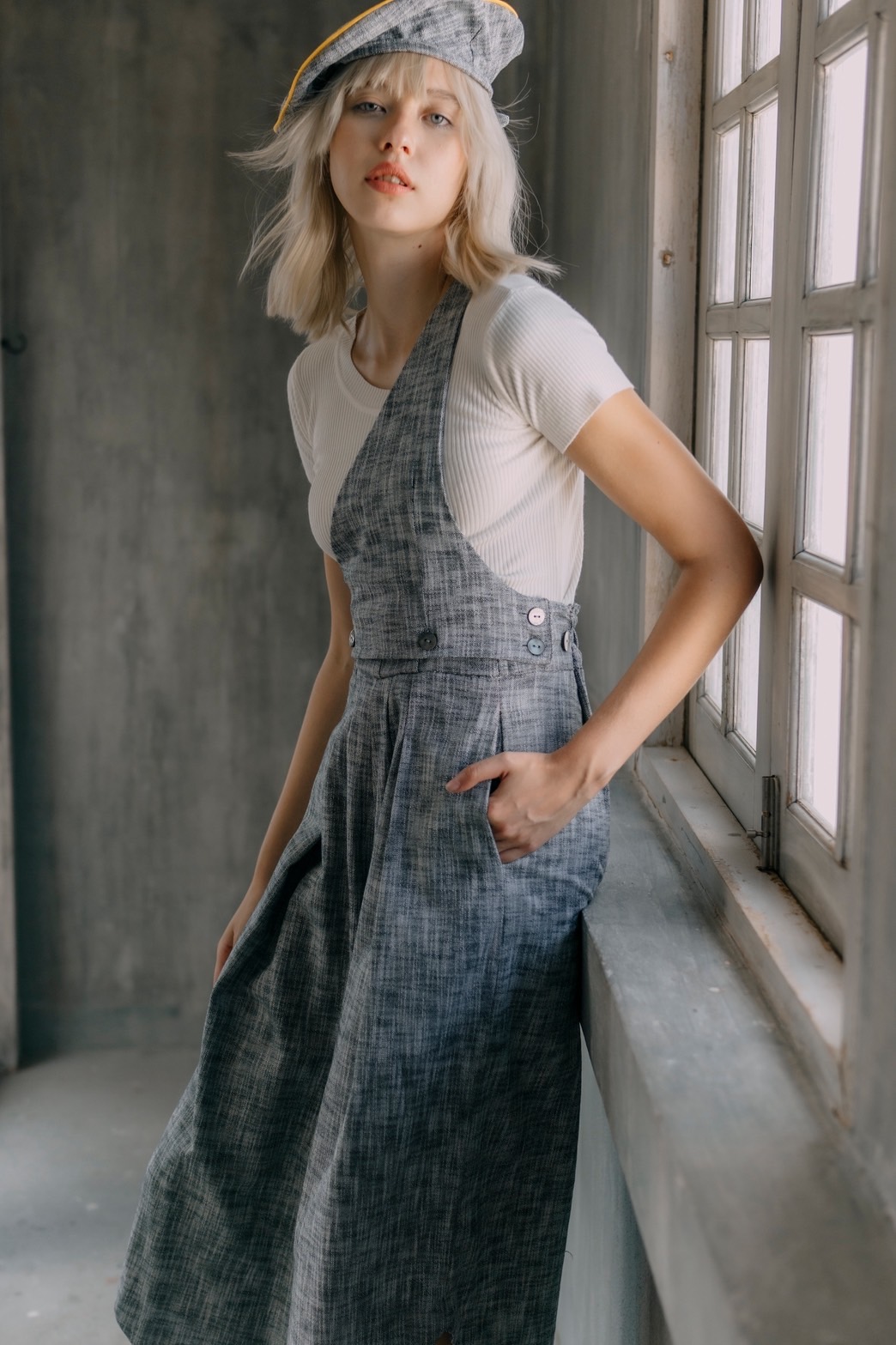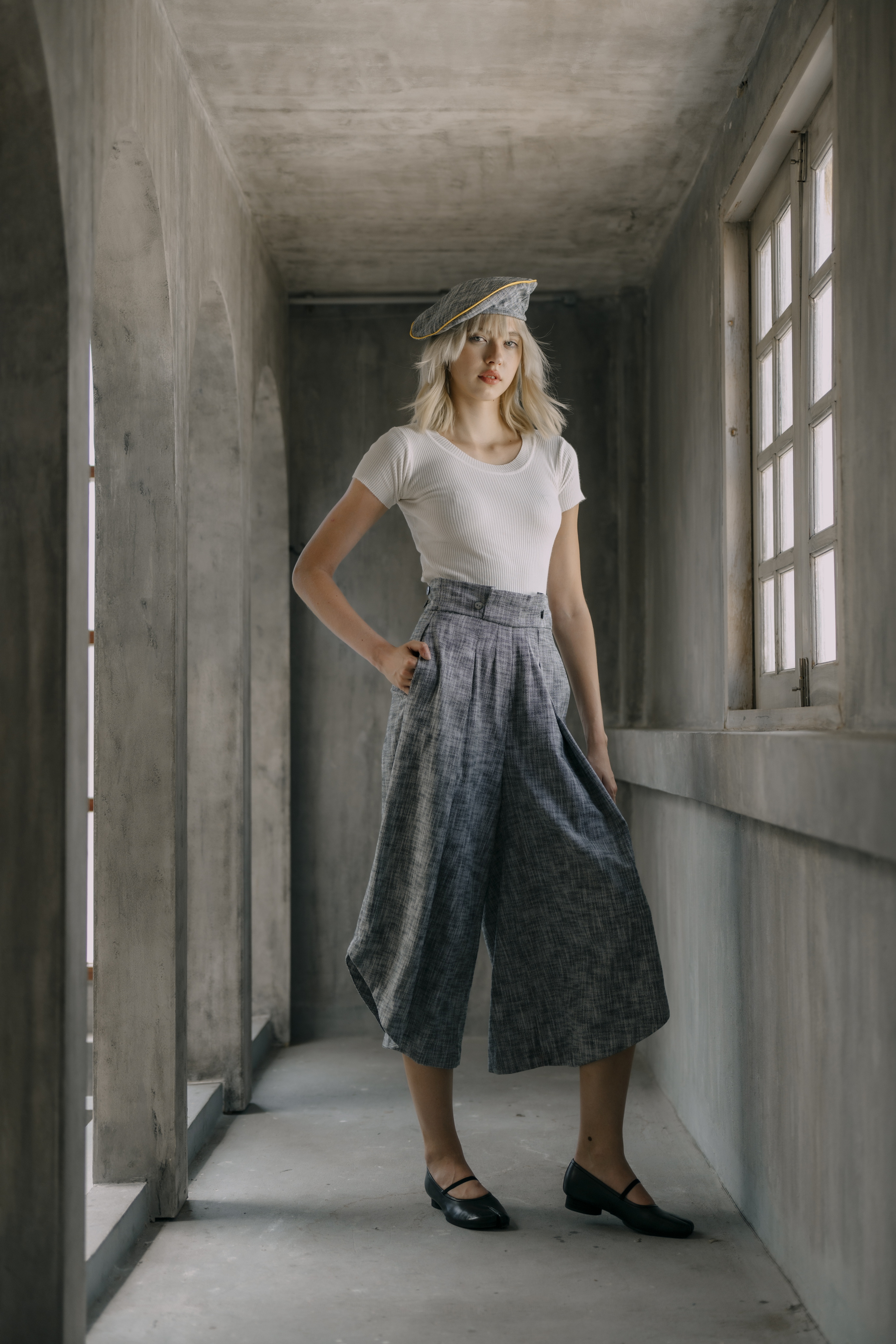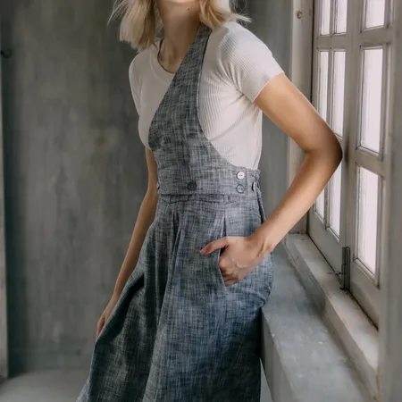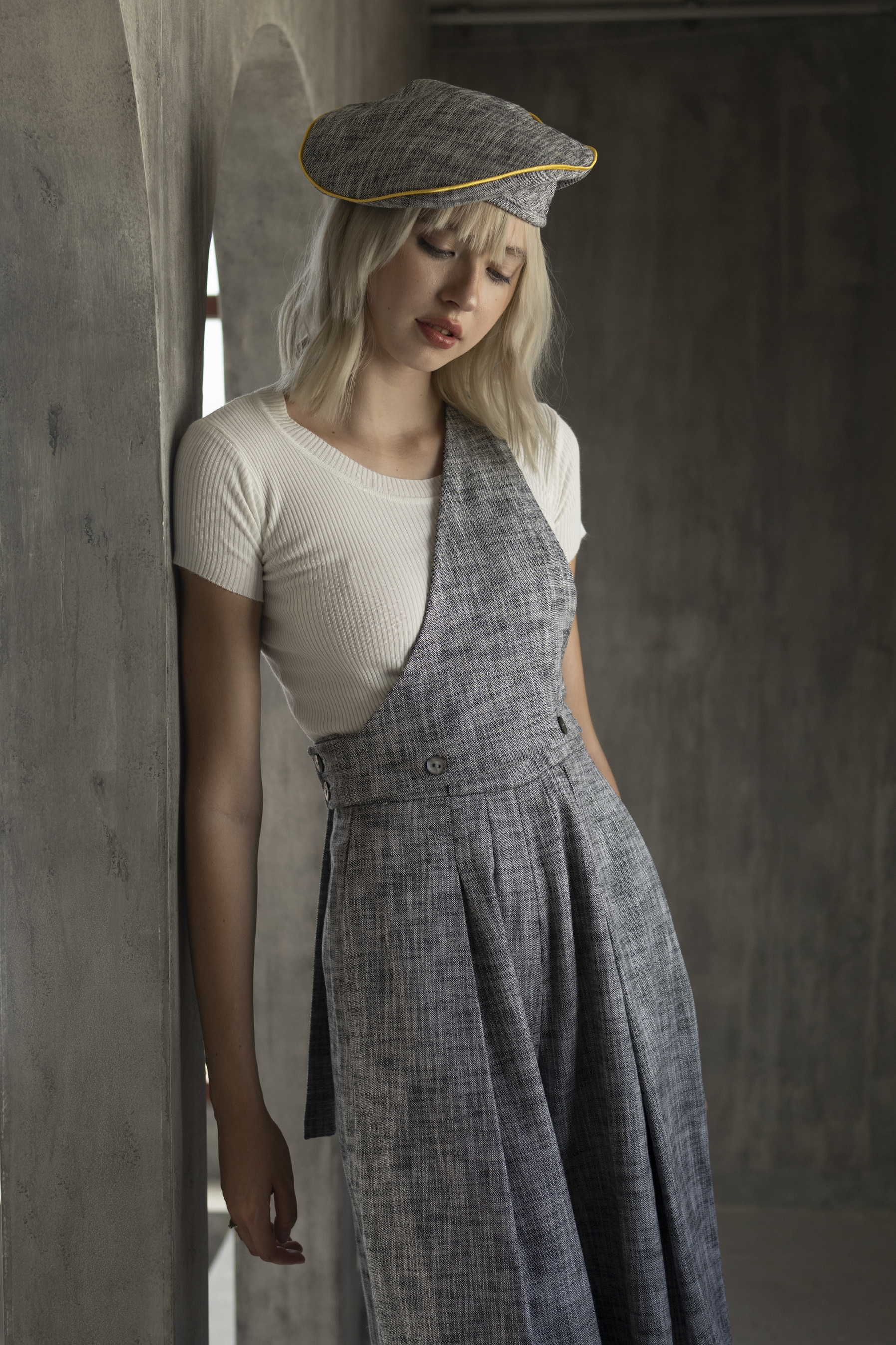 Modular wide-leg pants with detachable suspenders and pleated details.