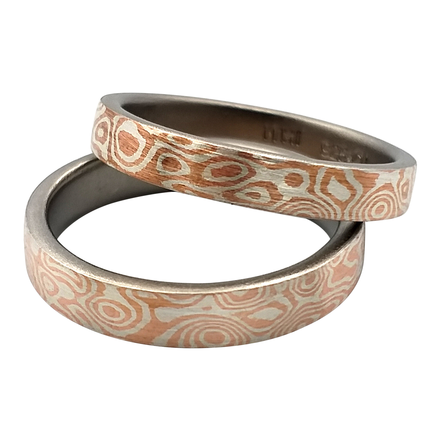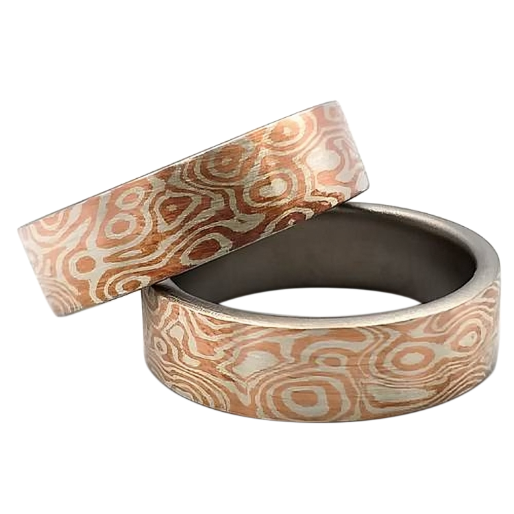 Made of full 20 to 30 layers of Mokume Gane, this ring is inlaid with a deep silver and copper alloy that is twisted together to obtain this design. The ring comes with a desirable comfort fit for extra satisfaction and is ideal for engagement or wedding rings.