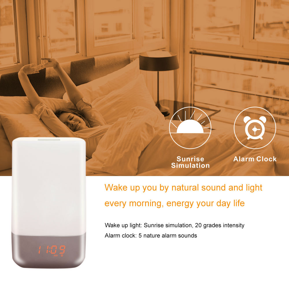 Wake up light + atmosphere light + alarm clock come out: wake up by 5 natural sound and light.