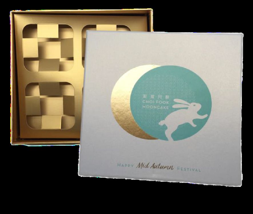 This mooncake box features a white box with a jade rabbit chasing the moon depicted on it, adorned with gold foil for an elegant touch. The inner box has a golden checkered pattern, integrating the essence of the Mid-Autumn Festival with a light luxury feel in one piece.