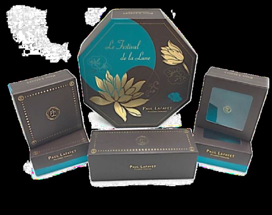 This set of boxes features a blend of deep brown and sky blue, adorned with golden lotus patterns. The large octagonal boxes are interspersed with the small square and elongated ones, presenting a refined elegance and a light luxury texture.