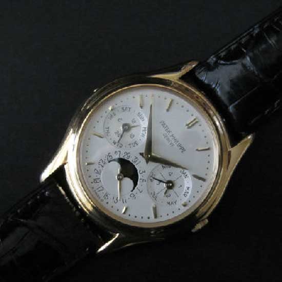 Featured is a luxurious brand name watch produced by Patek Philippe. The delicate moon phase construction boasts exceptional craftsmanship and skills. This enchanting watch presents timeless elegance and fine taste.