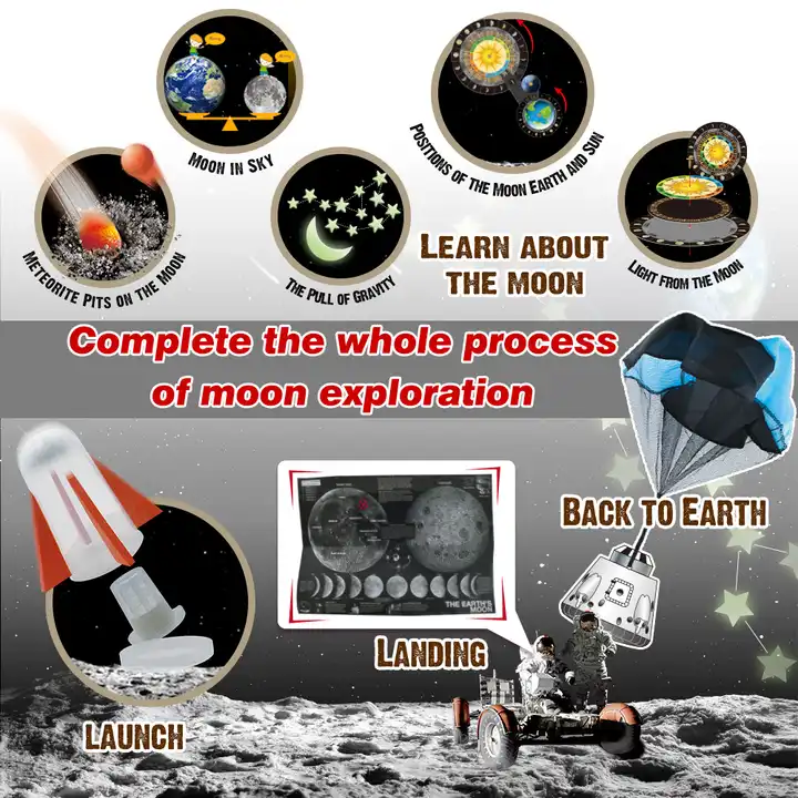 Find out the differences between the Earth and the Moon, the science about the Moon, how to launch a rocket, choose the landing space to made the moon landing and back to the Earth, and many more experimental activities.