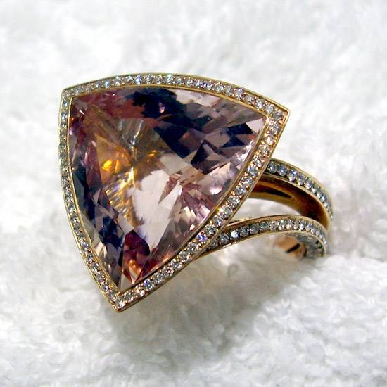 This ring has a morganite stone at the center in trillian shape. The stone has faceted cut which ehances the sparkling effect to the ring. The bead-set diamonds embellish the ring along the marganite and the shank.