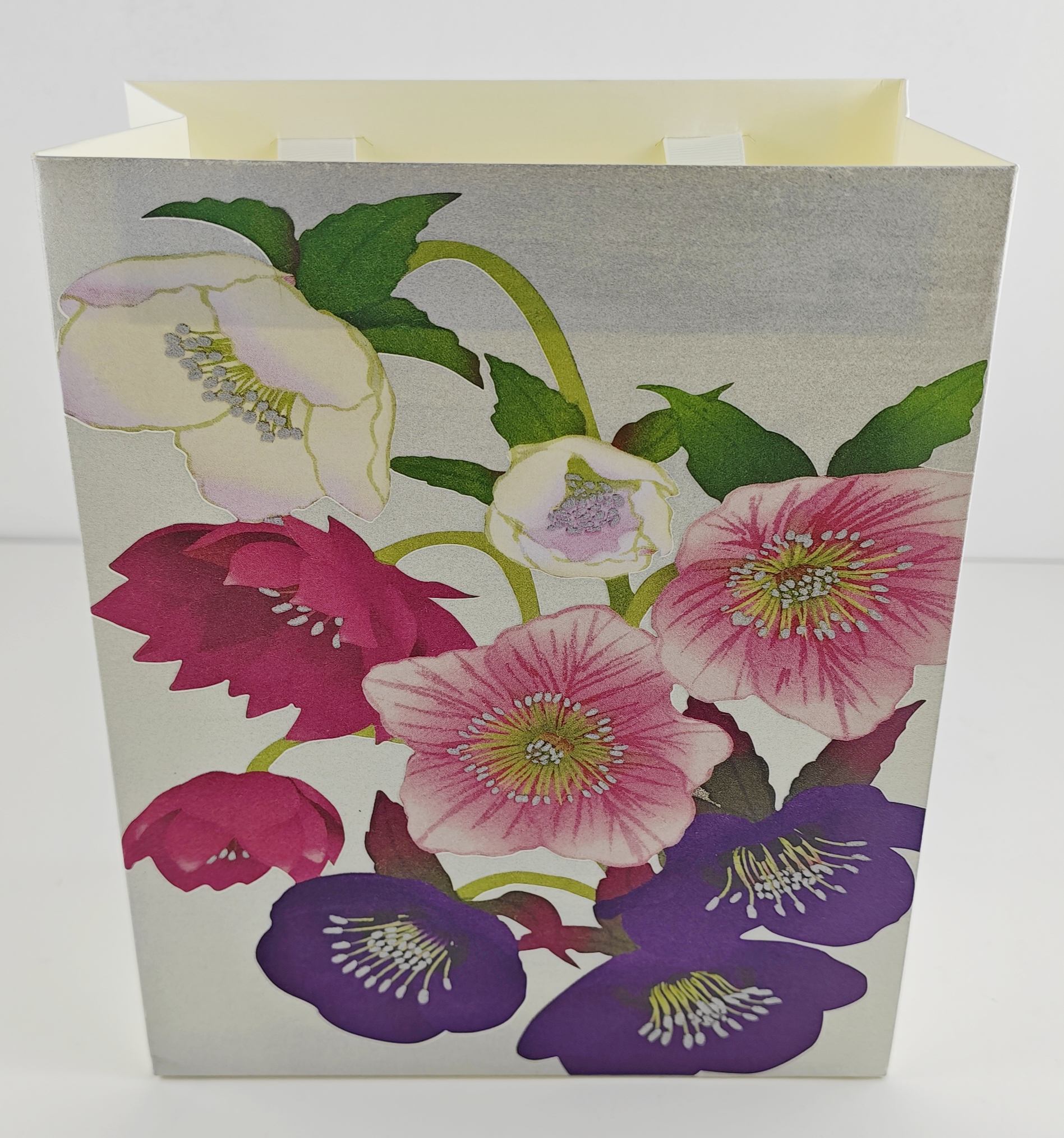 This medium bag features 4-color printing with delicate silver powder screen printing embellishments. It presents an elegant and premium overall effect, perfectly matched with white ribbed ribbon for a refined, attractive look.