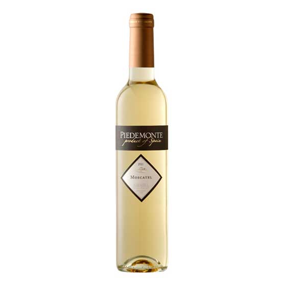 Displayed is a bottle of moscatel that comes from Spain. Using 100% Muscat, this dessert wine is sweet and pleasant with a fresh taste. This high quality table wine is aged for 2 years for a rich and enjoyable flavor.