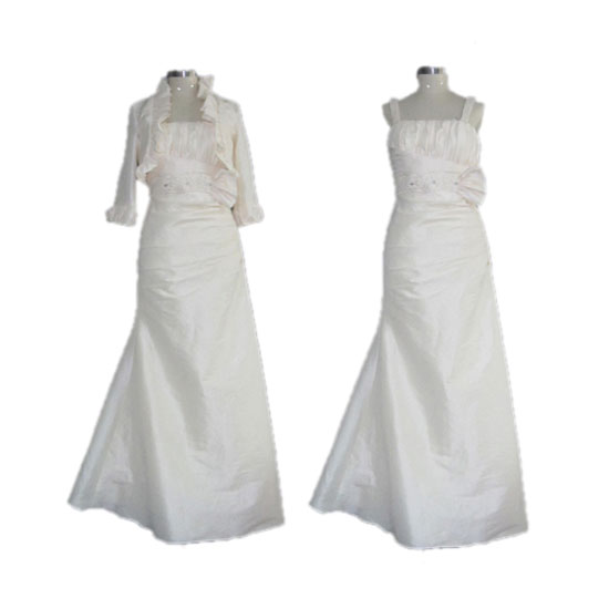 This elegant wedding dress is tailored for mother of the bridge. It is finely crafted with elasticity taffeta fabric with jersey lining. The flattering wedding dress pairs well with a cropped jacket with flounce hem.