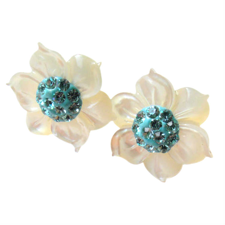 This pair of pierced earrings with floral design is surely a girl thing. The earring is beautifully crafted in 925 silver stud. It also creates a breathtaking sparkle with crystal granules on a colored setting. The pair features six intricately engraved flower petals made of mother of pearl which makes it an even more delicate one.