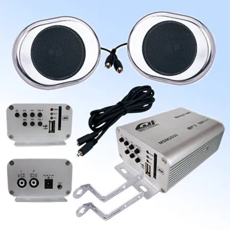 The motorcycle audio system features weatherproof loudspeakers and a detachable amplifier for all-weather use. It comes with a built-in FM radio with electric tuning. It supports CD, MP3 and MP4 formats. This motorcycle audio system simply delights your trips.