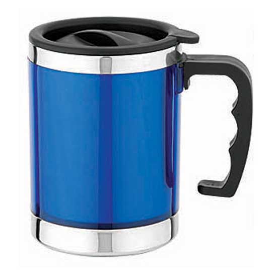 This stylish travel mug features a translucent blue body with a black handle and lid. The versatile travel mug can keep both hot and cold drink. The durable travel mug can serve you for a long period of time.