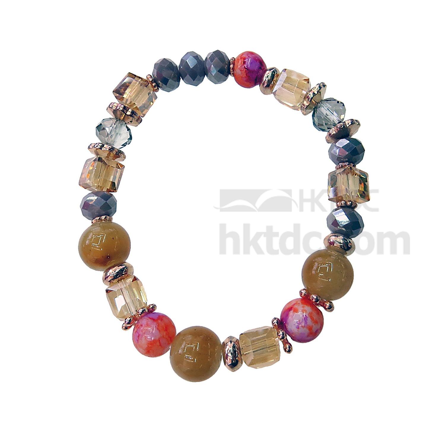 This is an elegant elastic bracelet made from a variety of beads and materials including glass beads, faux stone beads, alloy parts, plastic beads and CCB parts