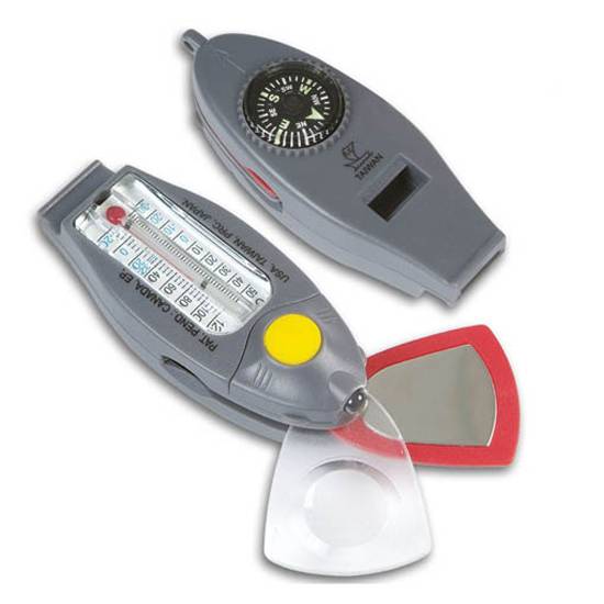 Included: whistle, compass, thermometer, magnifier, mirror, LED light.