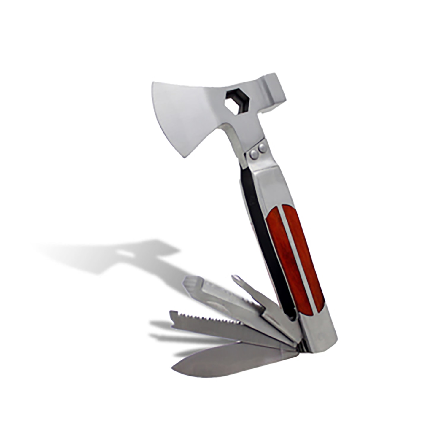 Multi functional hatchet hammer with large knife blade includes the following features: