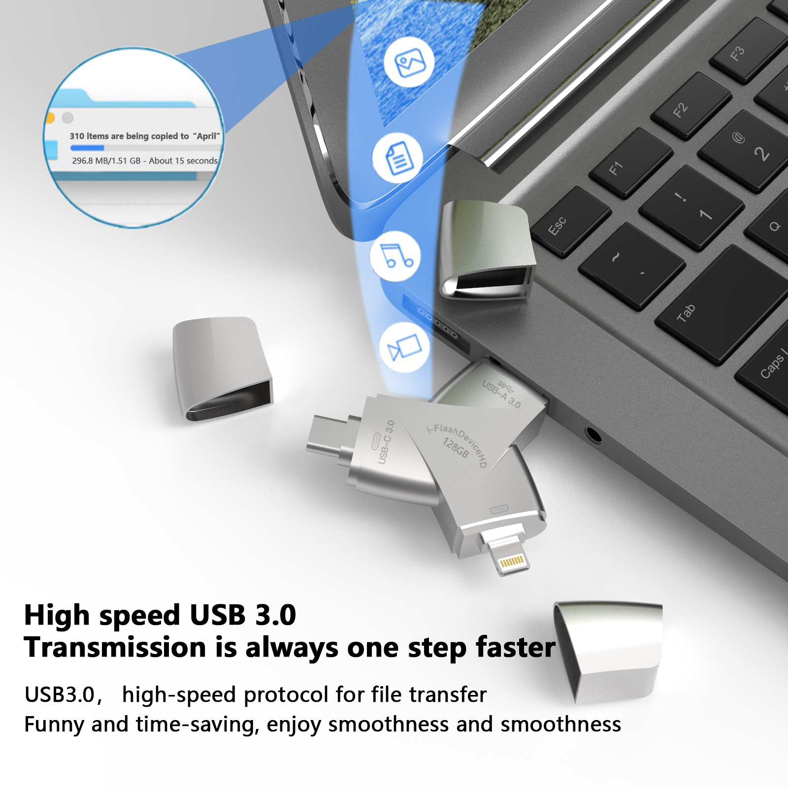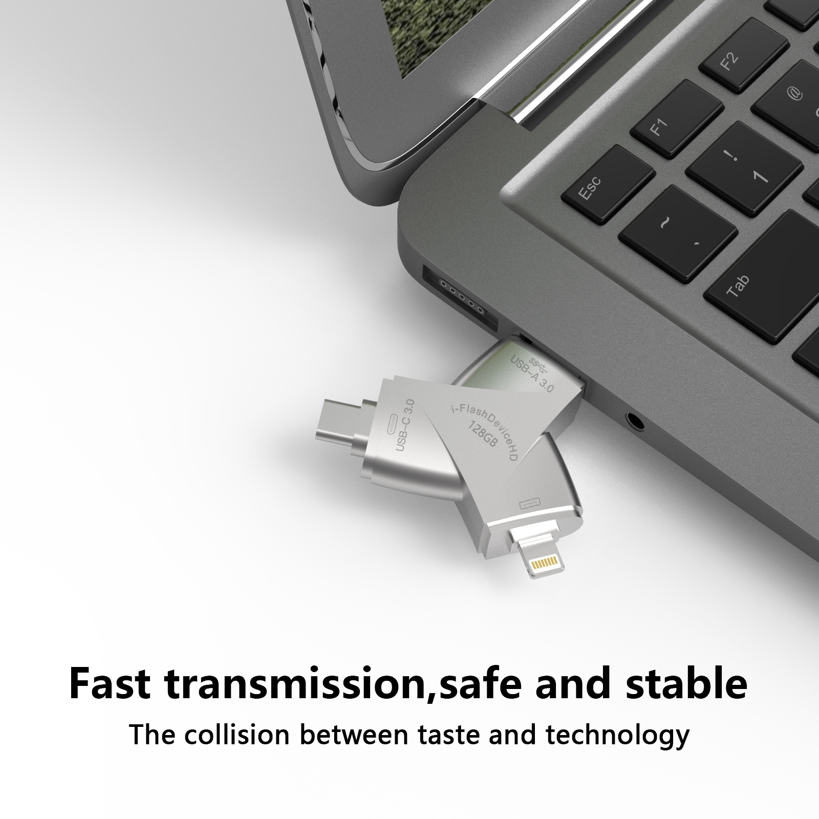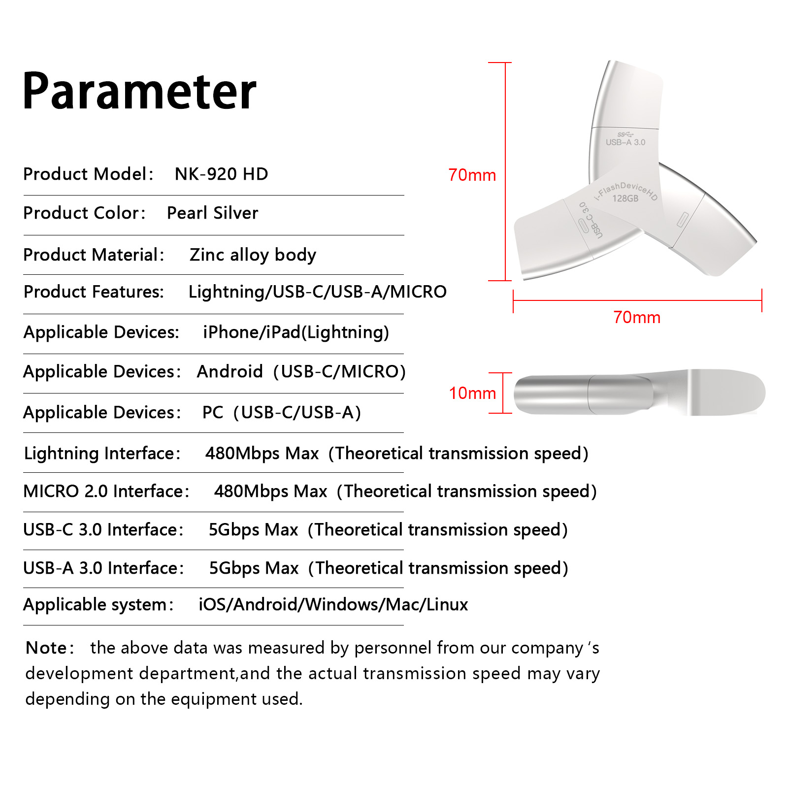 As a professional digital accessories provider, ZOIOT presents the NK-920 HD 4-in-1 USB 3.0 flash drive, designed for universal cross-device data storage and sharing. Featuring Lightning, USB-A 3.0, USB-C 3.0, and Micro USB four integrated interfaces, it supports plug-and-play across iOS, Android, Windows, Mac, and Linux systems, delivering high-speed transmission (USB-A/USB-C up to 5Gbps, Lightning/Micro USB up to 480Mbps) to transfer large files in seconds. Crafted from durable zinc alloy with a compact 70mm design, it resists rust and corrosion while ensuring easy portability. Paired with the exclusive "i-FlashDevice HD" APP, it enables one-click backup, instant photo saving, and intelligent file management to expand device storage and eliminate memory anxiety. Ideal for seamless data sharing between phones, tablets, and computers, it caters to cross-border e-commerce, wholesale, and corporate procurement needs with reliable performance.