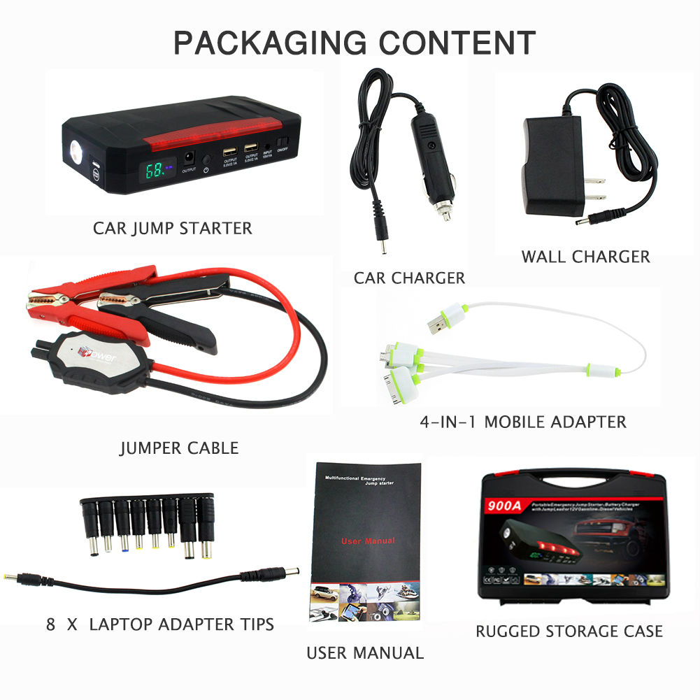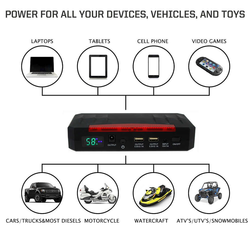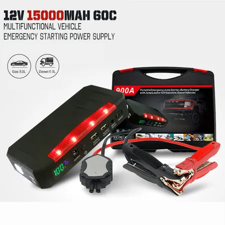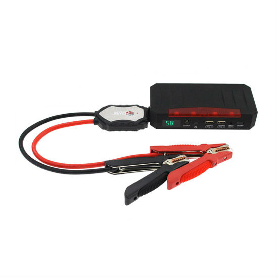 This car jump starter multifunction comes in a portable rectangular design and can be used as a torch with SOS and flashing functions. It has two clamps for connecting to vehicles and has two USB ports for charging mobile phones, laptops and other electronic devices. The car jump starter is an excellent tool for drivers and is very useful in emergency situations.