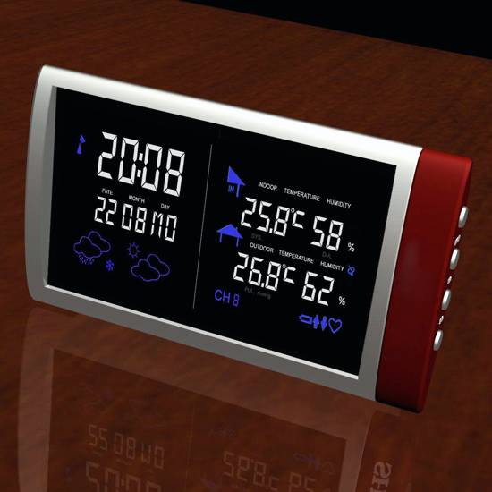 This is a multifunctional digital clock with a silvery frame and a LCD digital display. The digital clock measures and display the indoor/outdoor temperature and humidity, current time, weather and the current date and day.