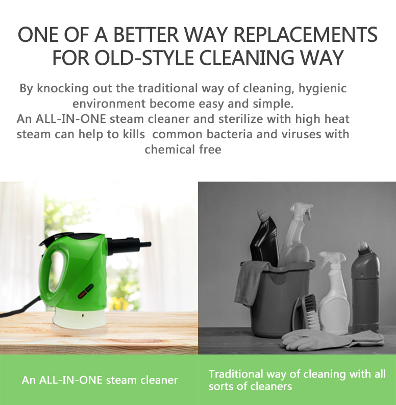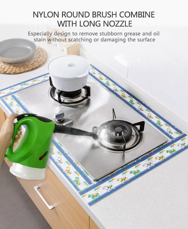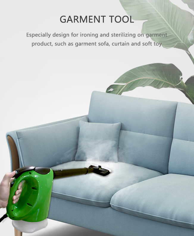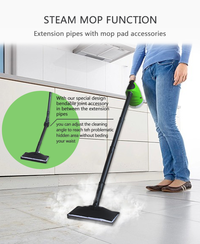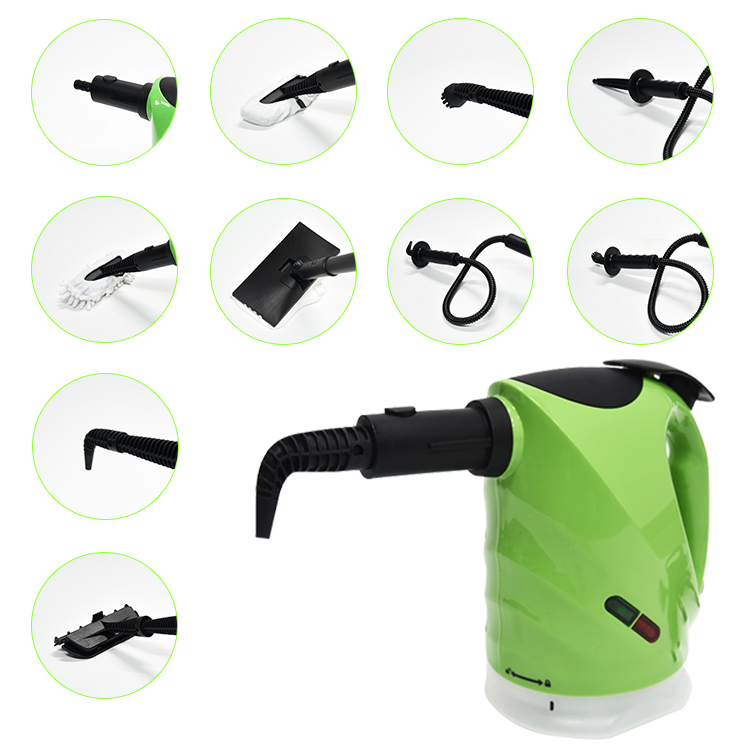 1pc of 450ml water tank, 1pc of round nylon brush, 1pc of bent nozzle, 1pc of long steam nozzle, 1pc of garment tool, 1pc of window squeege, 1pc of 100cm soft pipe, 1pc of cleaning cloth, 1pc of mop head, 3pcs of extension pipe, 1pc of 320g mop cloth and 1pc of carpet glider