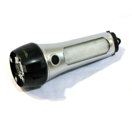 Featured is a flashlight with a textured body for a firm grip. The flashlight can also work as a hammer or a cutter. It makes an essential item for camping or other outdoor activities.
