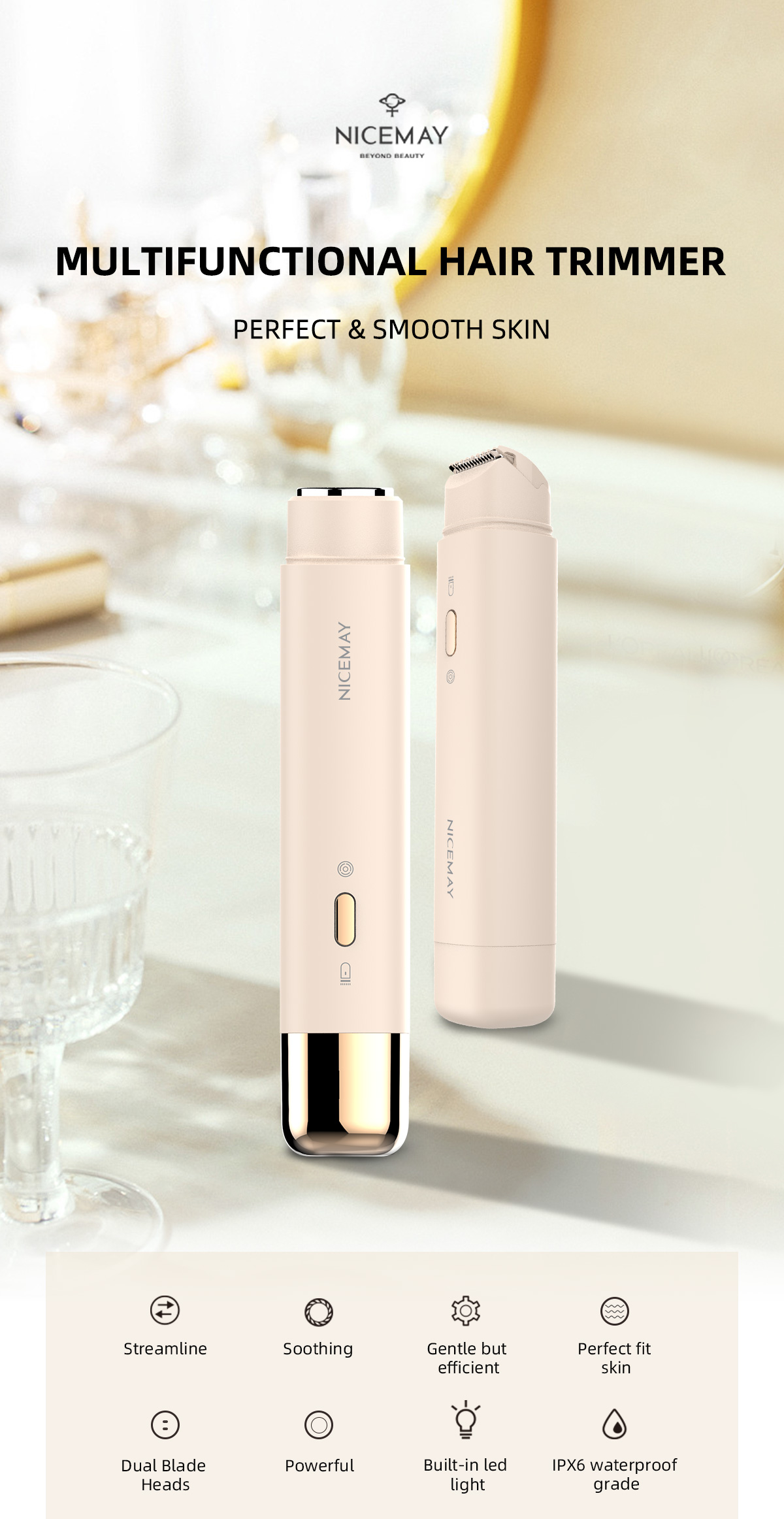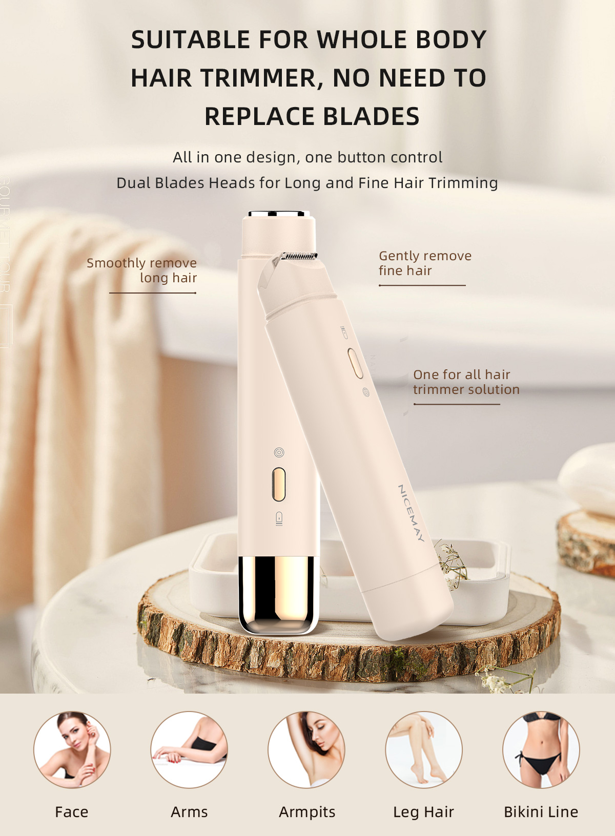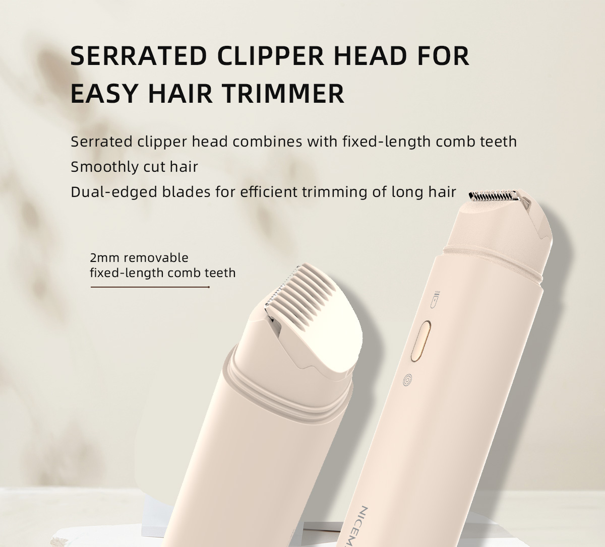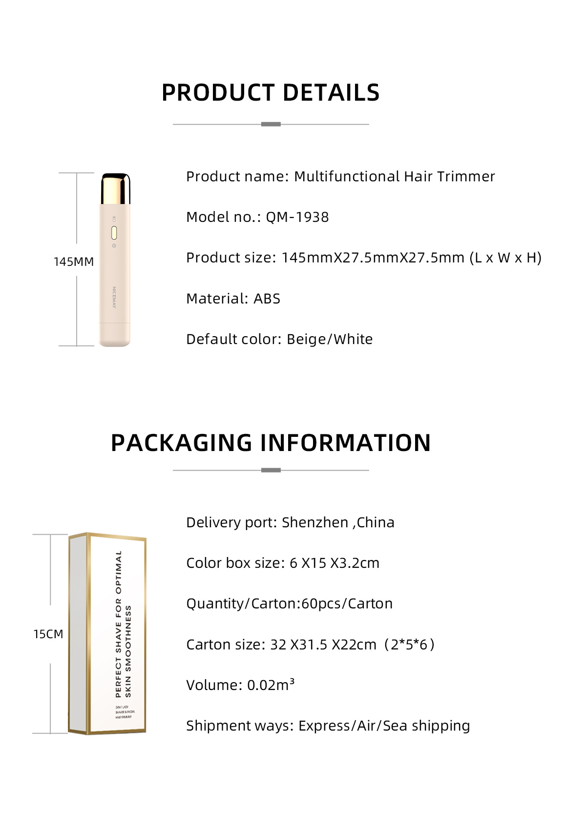 QM-1938 Multifunctional Hair Trimmer is a double-head hair trimmer for the body and face. The serrated cutter head matched the detachable 2mm comb for removing unwanted long hair smoothly and effectively. The 3D floating head makes it fit the skin down automatically when removing the head, to prevent a false start.