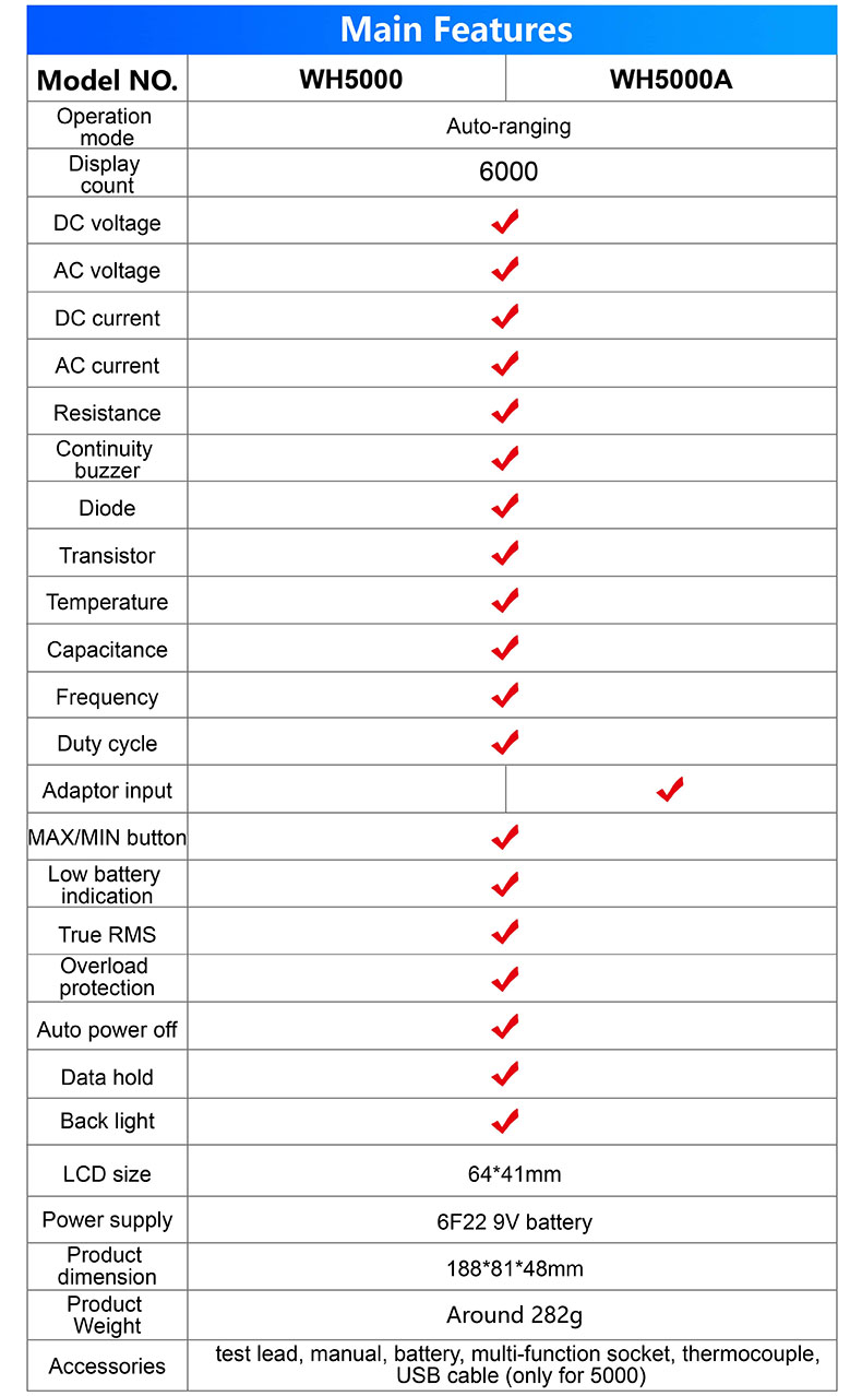 Multimeter True RMS 6000 Counts Auto Range Best Digital Multimeter WH5000A Multitester