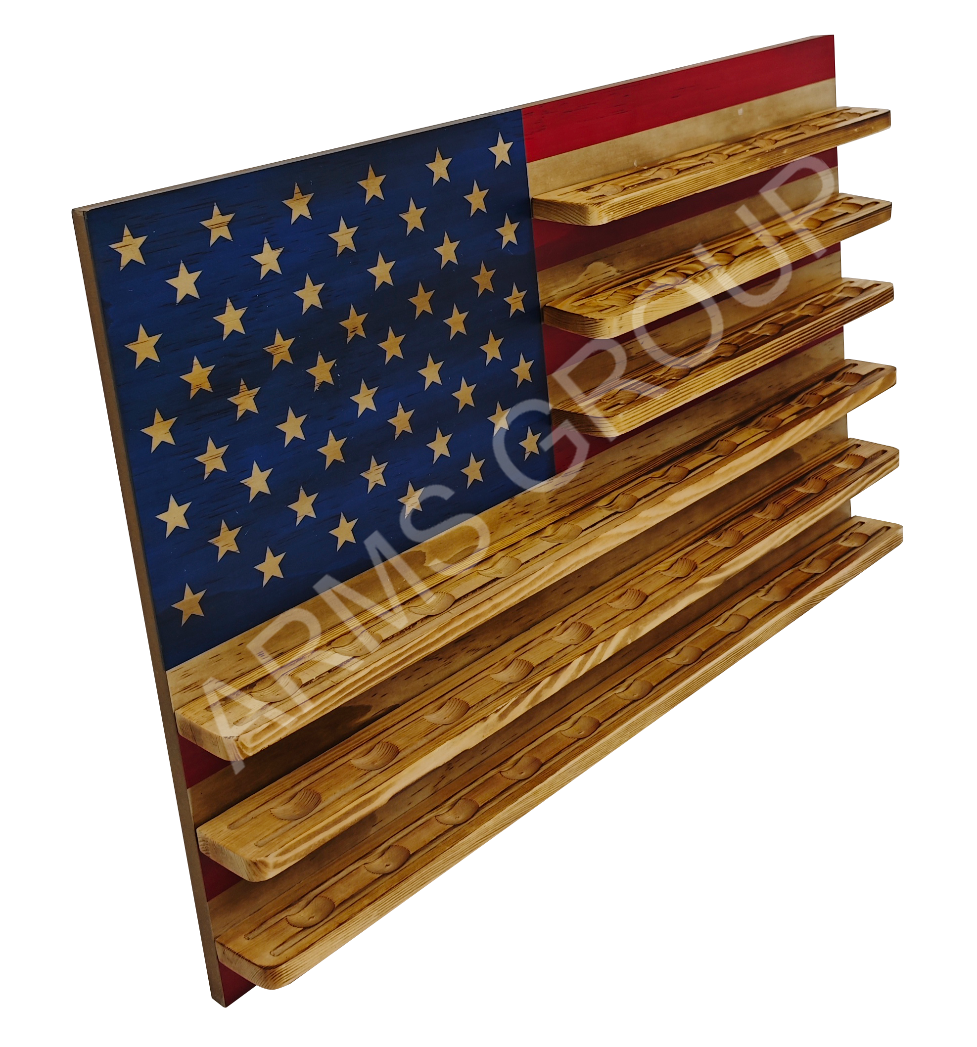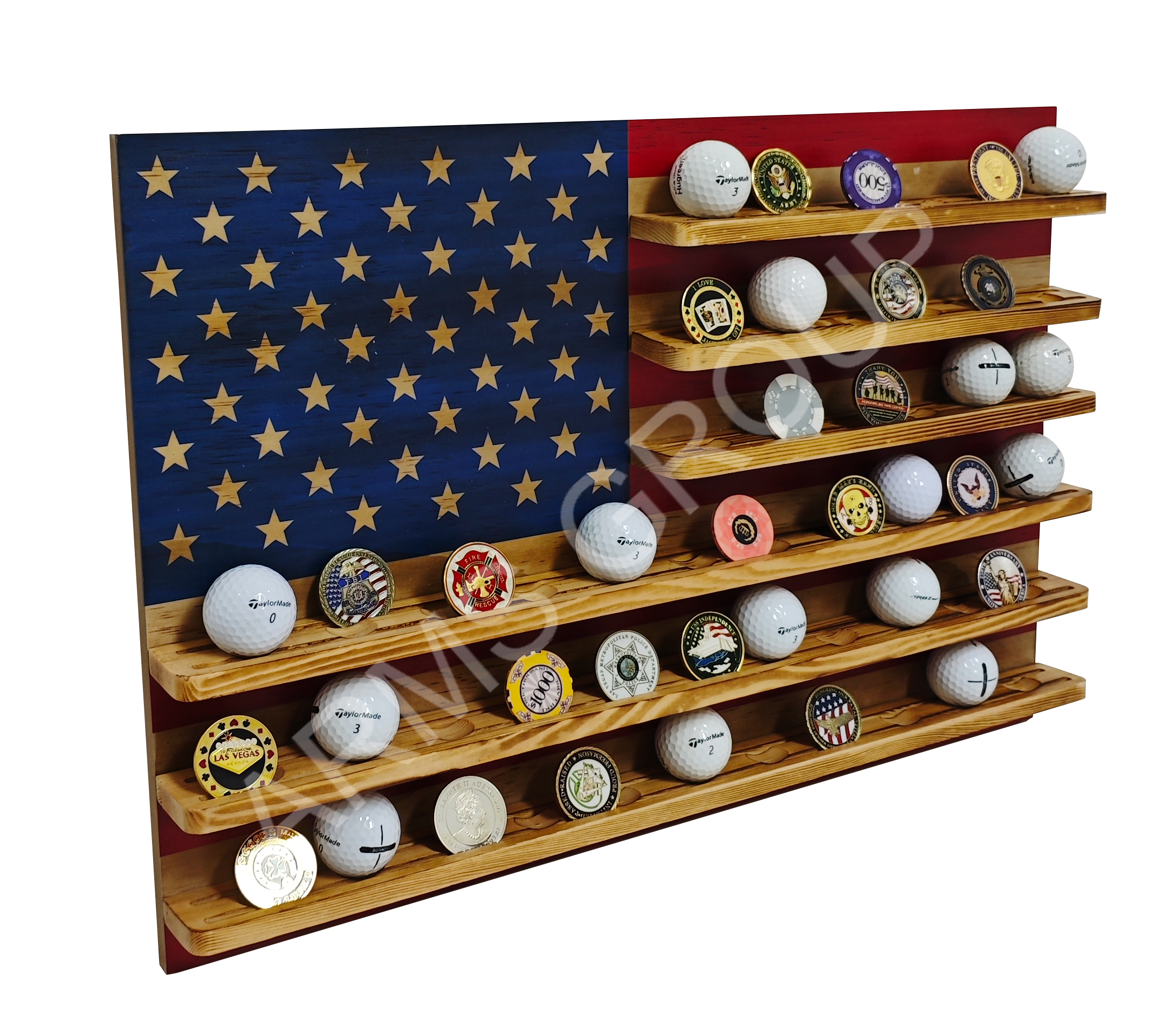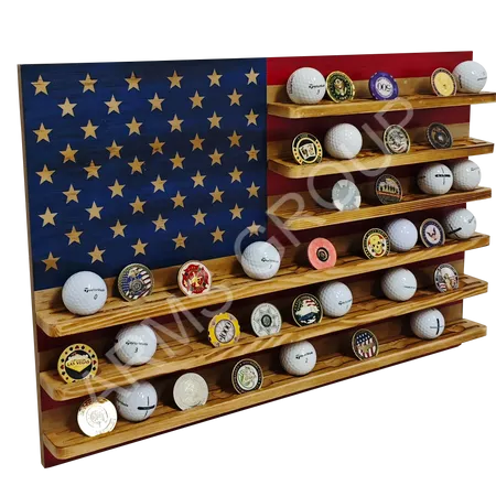 Crafted from premium wood with a striking American flag design, this multiple-tier display rack is ideal for showcasing golf balls, challenge coins, or other collectibles. The carved stars and alternating stripes highlight patriotic aesthetics, while the sturdy shelves provide organized storage. Perfect for home décor, sports memorabilia collections, or as a distinctive gift item. Customization with logo or engraving is available.