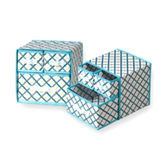 The multipurpose storage box features a double-tiered design. It is finished with 3 drawers in total. This piece features a rhombus-shaped background with matching light blue trims.