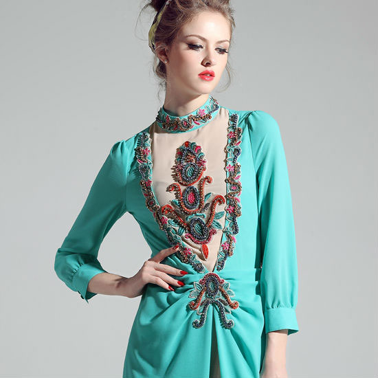 This is a Muslim-style, handmade, beaded dress that features fine workmanship. This one is of the highest quality and the design is extraordinary. It is an excellent choice for parties and semi-formal functions.