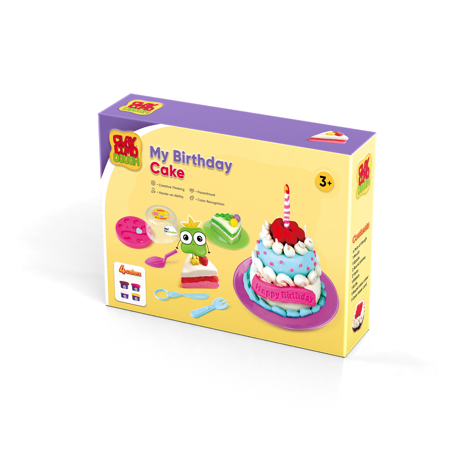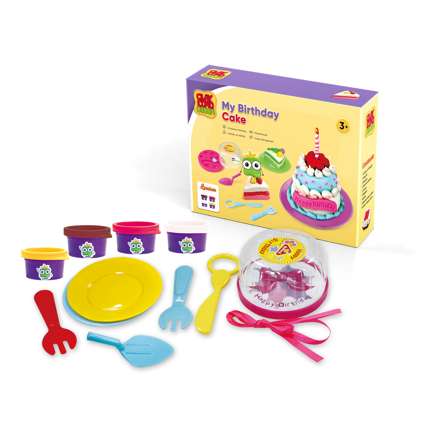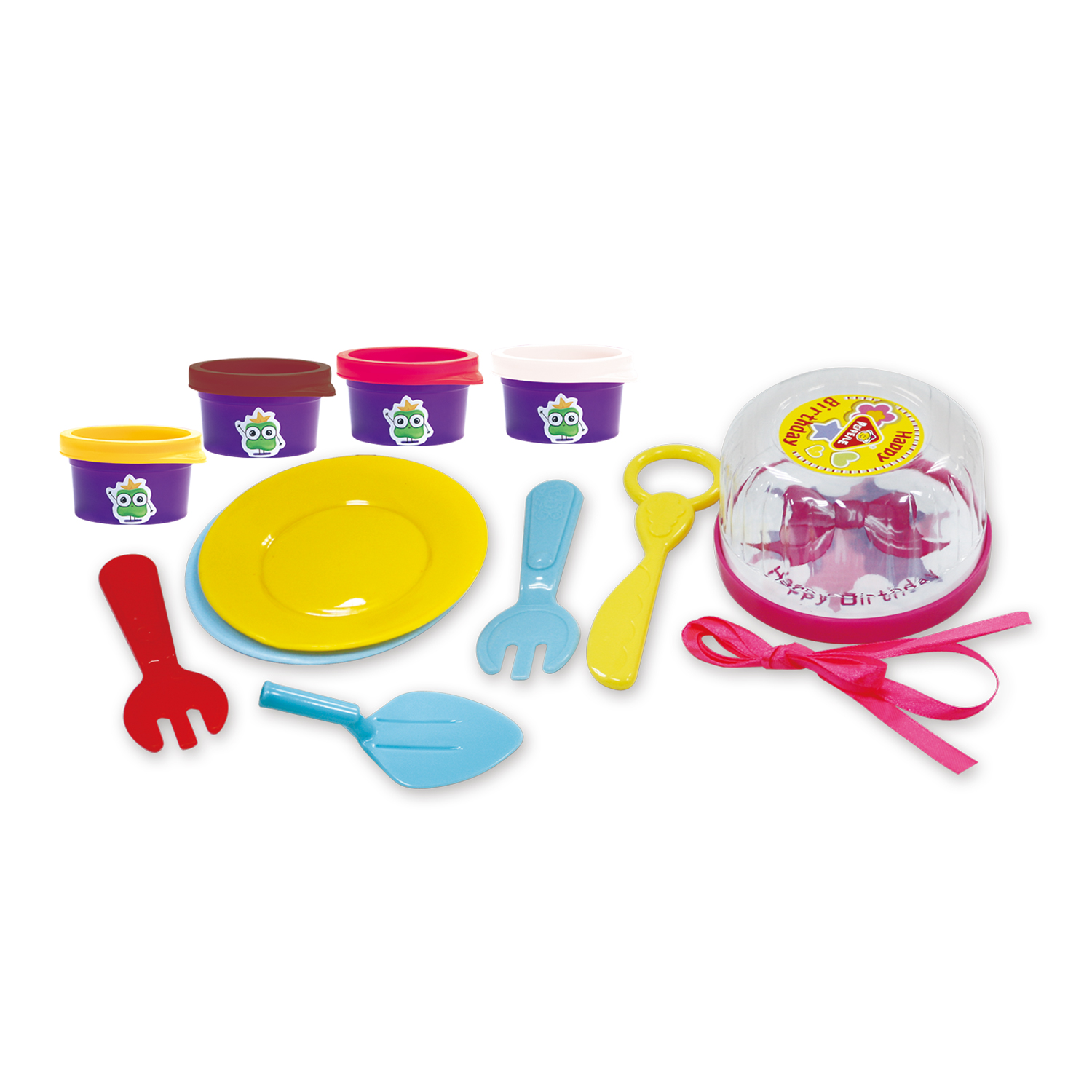 4 colours of dough,2 plates,2 fork,1 shovel,1 knife,1 cake box