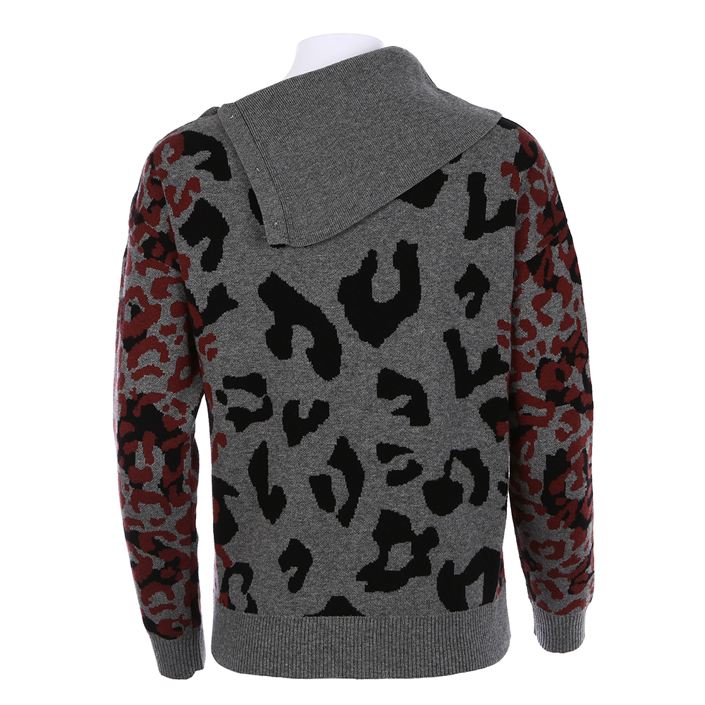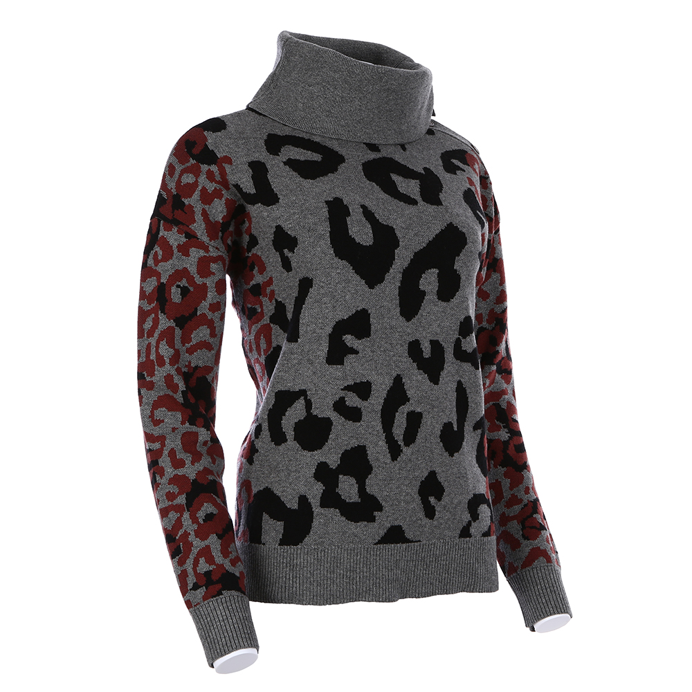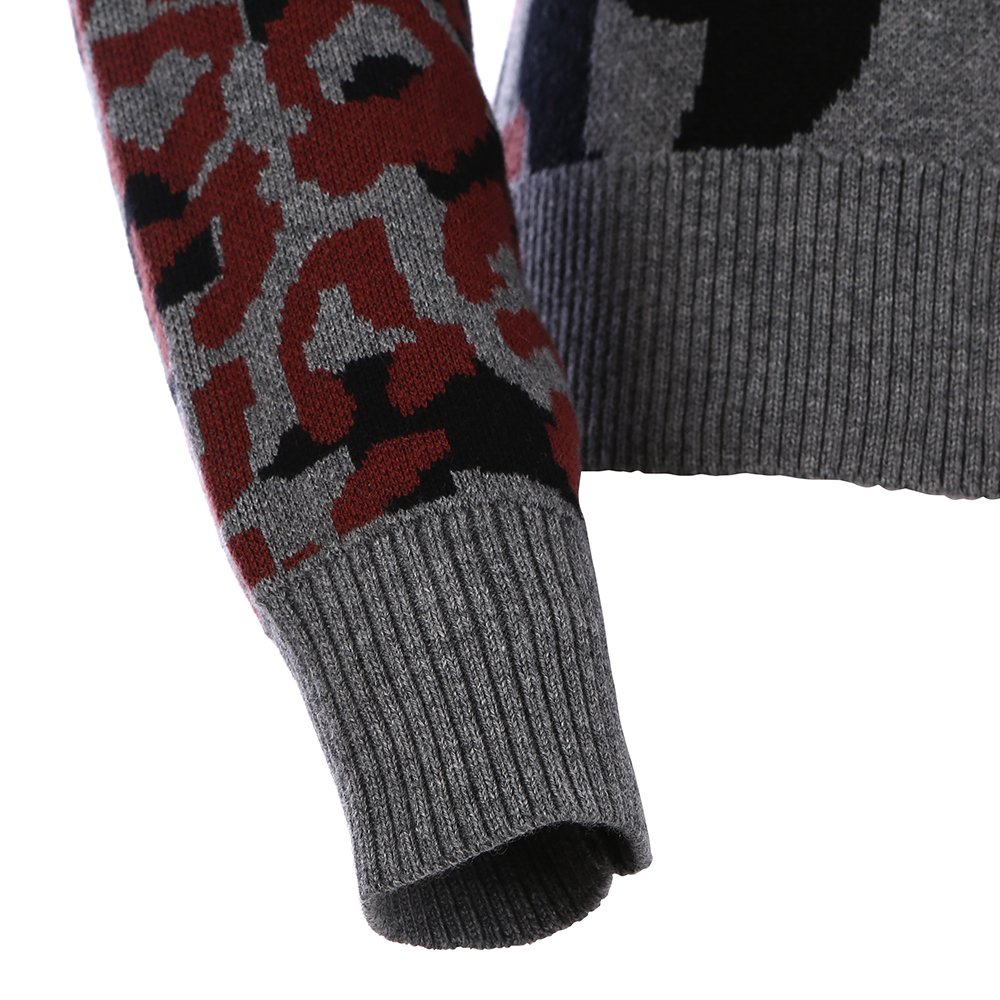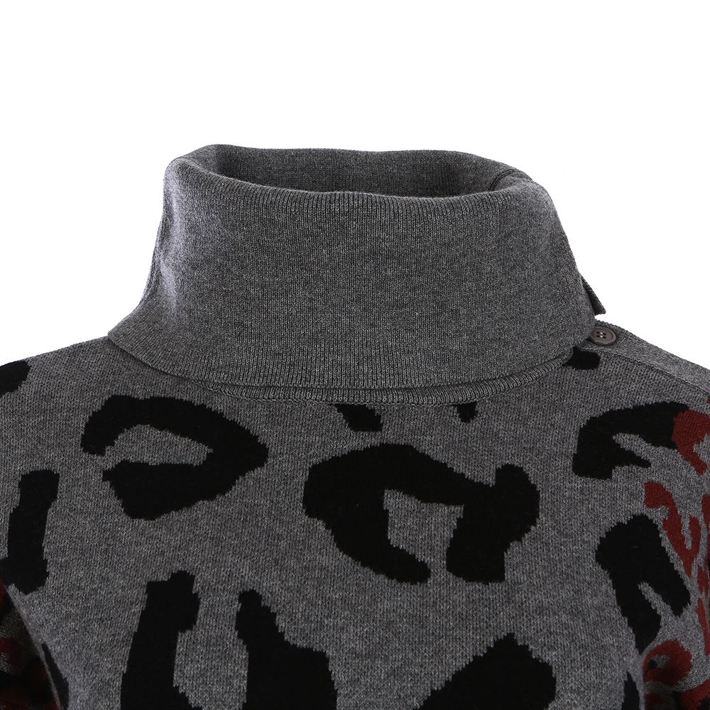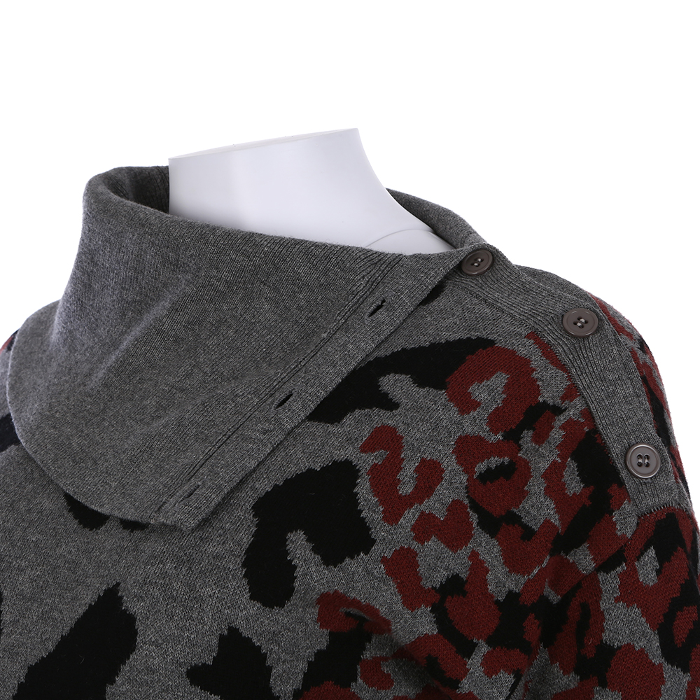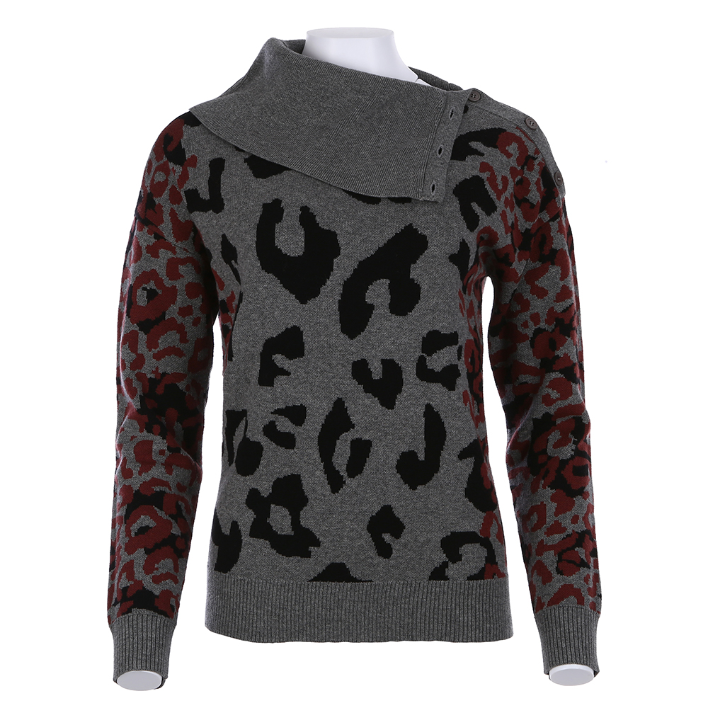 The sweater's standout feature is its asymmetrical neckline, which incorporates a fold-over collar fastened with decorative buttons for a modern and chic touch. This design element adds an extra layer of style and makes it a unique wardrobe addition. The main body showcases a striking leopard print in shades of black and gray, set against a medium-gray background. The sleeves add an extra dimension of interest with their dark red and black leopard patterns, providing a bold contrast and enhancing the sweater's overall visual appeal. The sweater is cut for a slightly tailored fit, flattering the figure without being overly tight. The ribbed cuffs, hem, and collar provide structure and a snug finish, ensuring that the sweater stays in place while adding to its polished appearance. The neutral color palette of gray, black, and dark red makes it versatile and easy to pair with various outfits, whether dressed up with tailored pants and heeled boots for a sophisticated look or styled casually with jeans and sneakers for a relaxed day out.