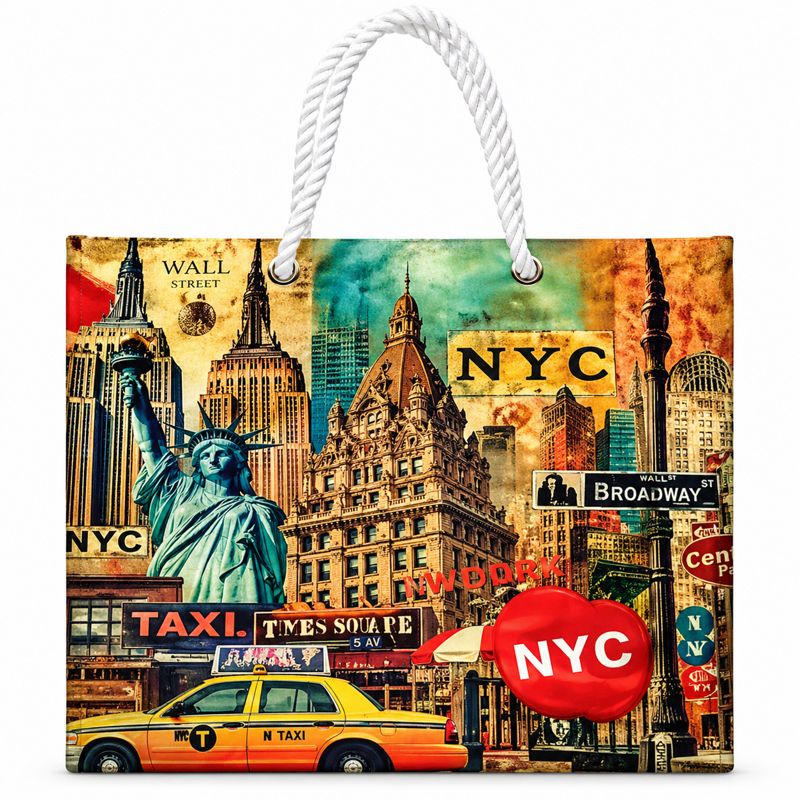 Durable and lightweight, this 12 oz polyester bag features vibrant digital printing with a striking NYC-themed collage. Designed for everyday use, it comes with sturdy rope handles for comfortable carrying. The high-quality polyester fabric ensures long-lasting color retention and resistance to wear, making it perfect for shopping, travel, or promotional use.