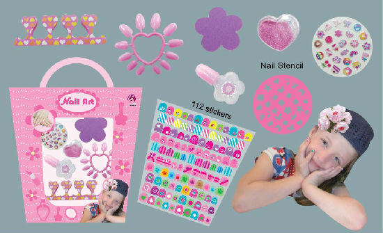 - The nail art kit features 10 pieces of artificial nails, nail stickers and assorted accessories.
