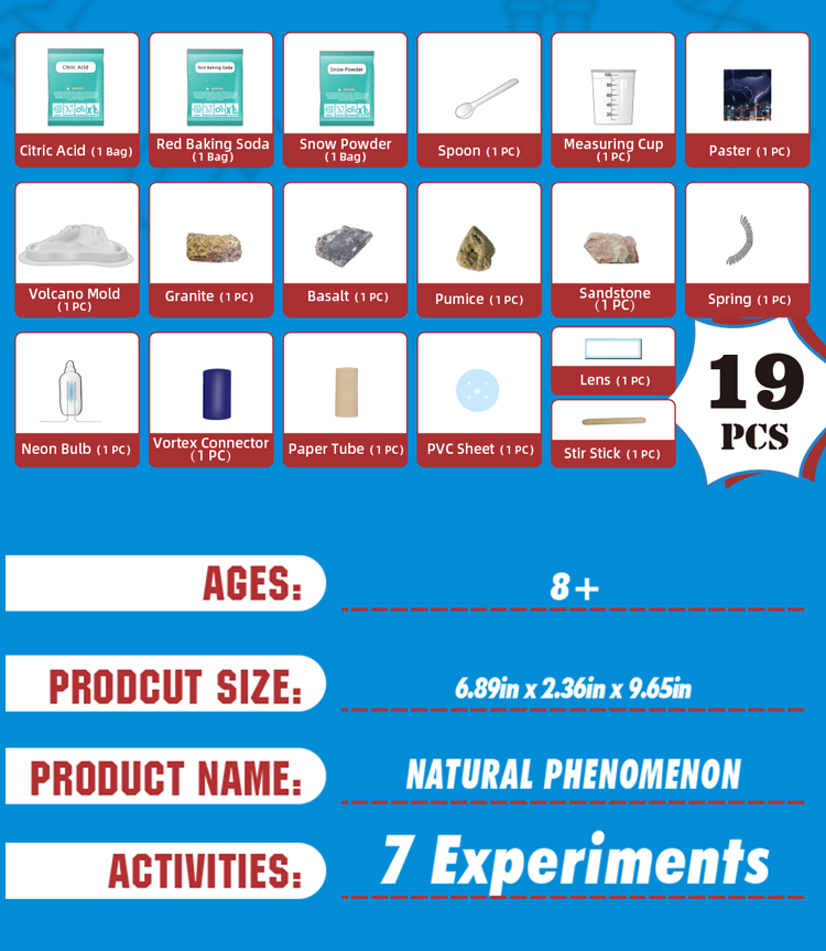 这种自然现象包括 1 袋柠檬酸、1 袋红小苏打、1 袋雪粉、1 个火山霉、1 个花岗岩、1 个玄武岩、1 个浮石、1 个砂岩、1 个勺子、1 个量杯、1 个粘贴器、1 个涡流连接器、1 个纸管、1 张 PVC 板、1 个弹簧、1 个霓虹灯泡、1 个透镜、1 个搅拌棒。