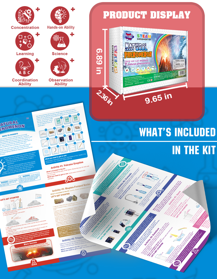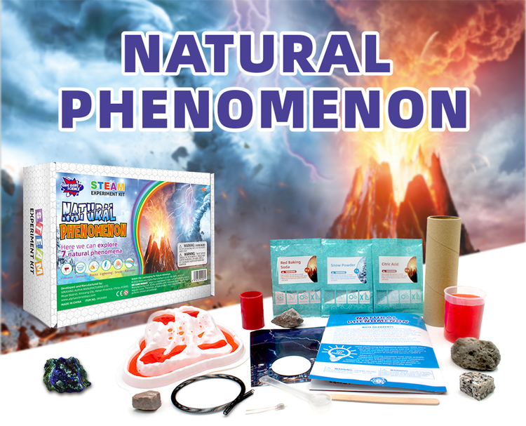 自然现象为您提供了进行化学反应和实验所需的一切。在这个套件中,孩子们可以自己制作雪、龙卷风、火山。当他们在眼前创造自然现象时,他们会非常高兴并感到成就感。他们会对自然奇迹感到惊讶。