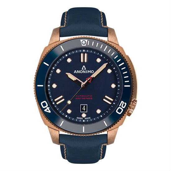 Opt for a sumptuous yet stylish complement to your daily ensembles with this Nautilo from Anonimo. The bronze case jumps out on the overall blue-toned construction, setting the piece apart from the rest with a striking highlight. The Swiss-made watch offers a mechanical mechanism with the bold markers and hands along with the calendar to keep you up with your schedule.