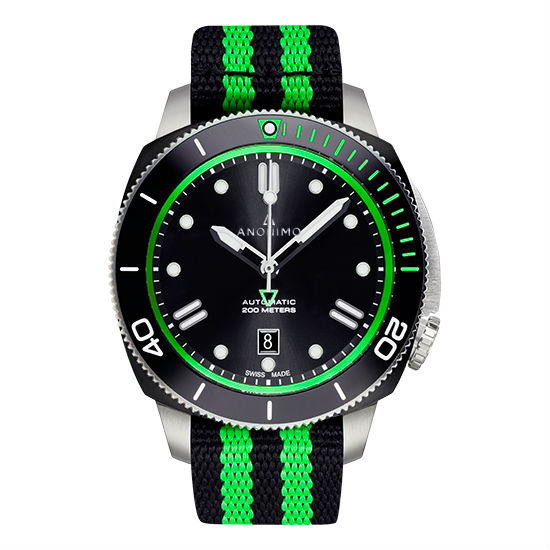 Bring a refreshing splash of color to your summer look with this Anonimo Nautilo NATO edition. Designed with a clean, bi-color steel case worn on the brightly-striped NATO strap, this wristwatch combines the rugged sports chic with Swiss-made precision seamlessly in clean, dynamic lines. This automatic watch displays the time and date with contrasting details set on the black dial, accompanying your adventurous activities with easy readability and superb water resistance.