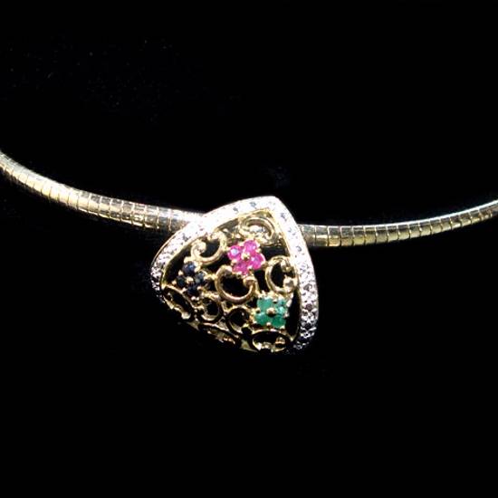 - Ruby, sapphire and emerald stones arranged in floral shapes on the pendant.
