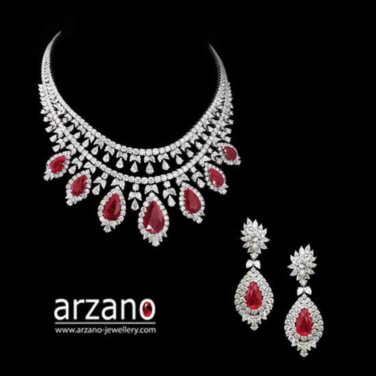 This stunning necklace and earrings set spotlights large pear-shaped red stones accented with tiny white stones. The jewelry set exhibits an eye-catching vintage design with refined details. This gorgeous necklace and earrings are perfect for wearing at formal occasions.