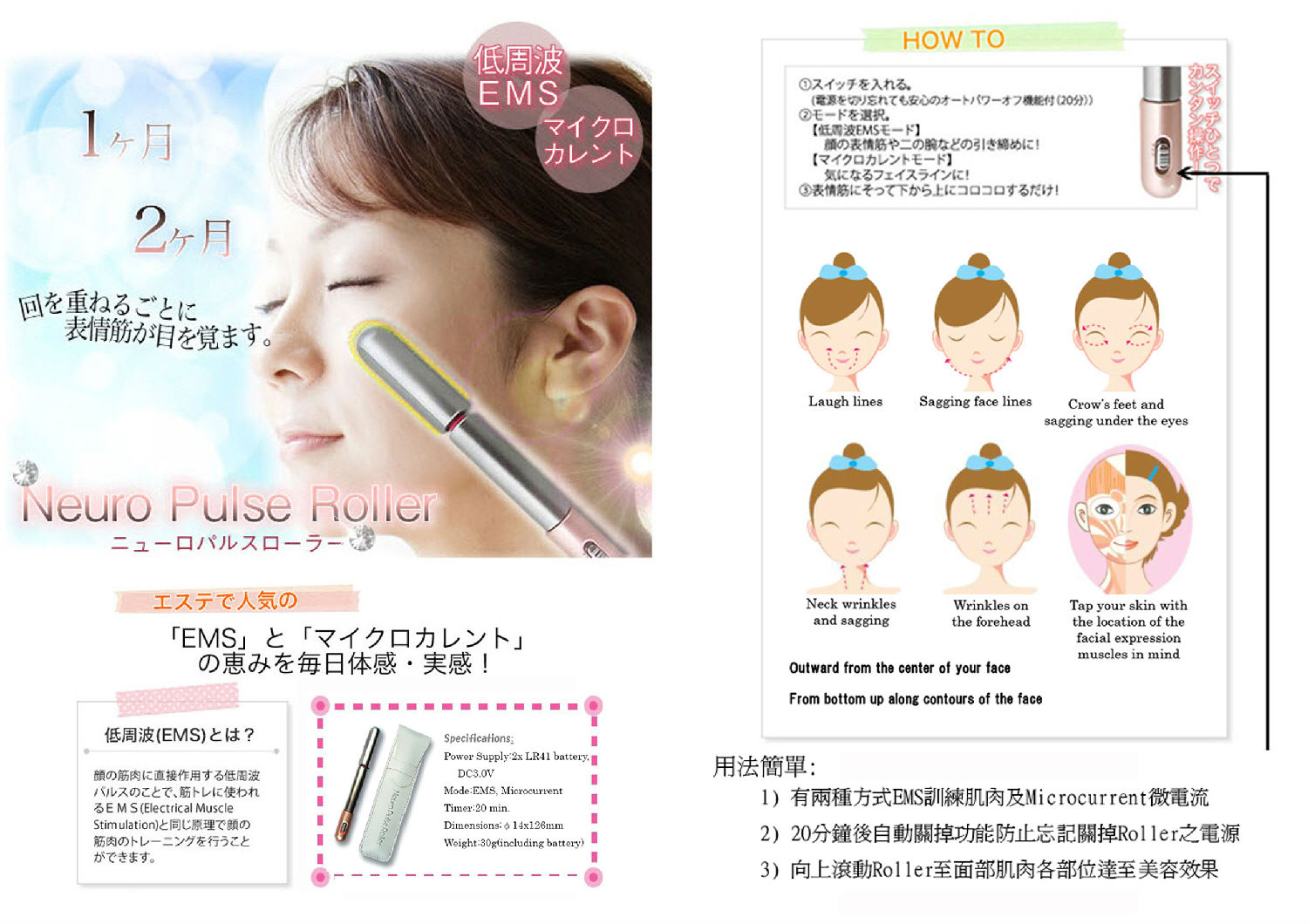 Our brain send signal as (Micro-current) to heal the injured parts of our body regenerating the mitochondria in the cells (ATP- Adenosine Triphosphate) The Neuro Pulse Roller works using the same principles sending the micro-current on the same level the Body does rejuvenating (energizing) the cells of the face bringing a health and beautiful skin appearence.