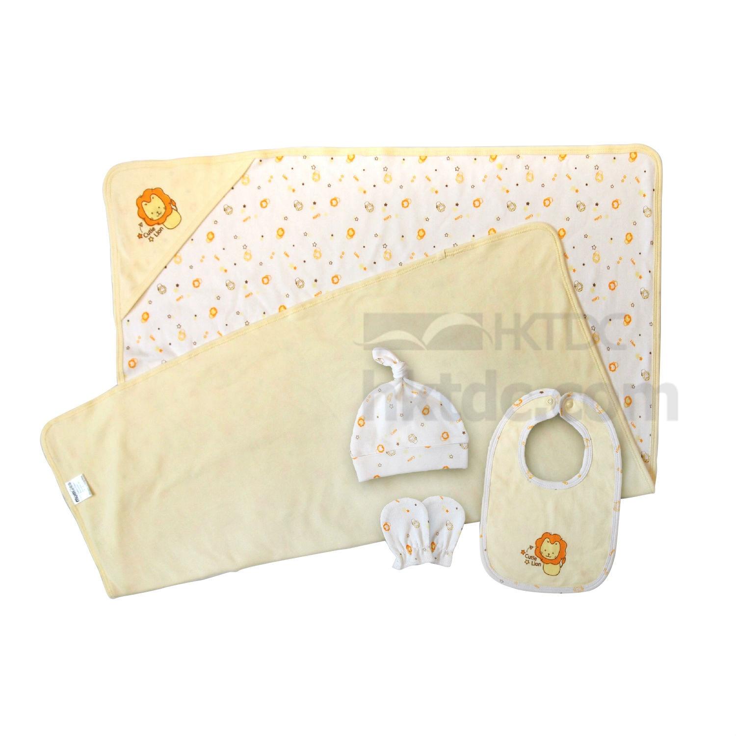 This baby blanket set includes a blanket, a hat, a pair of gloves and a bib. It is made of 100% cotton and features an adorable embroidered lion. In a versatile and lovable design, this cotton blanket set will coordinate with different styles of ensembles. It also makes an ideal gift for a baby shower.