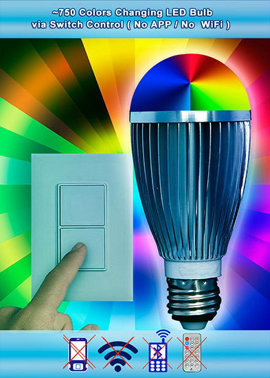 Featured here is a LED light bulb with 750 changing colors. It is equipped with a finned heat sink and has a screw type base for easy installation. This LED light bulb is controlled via a switch and offers bright and colorful illumination.